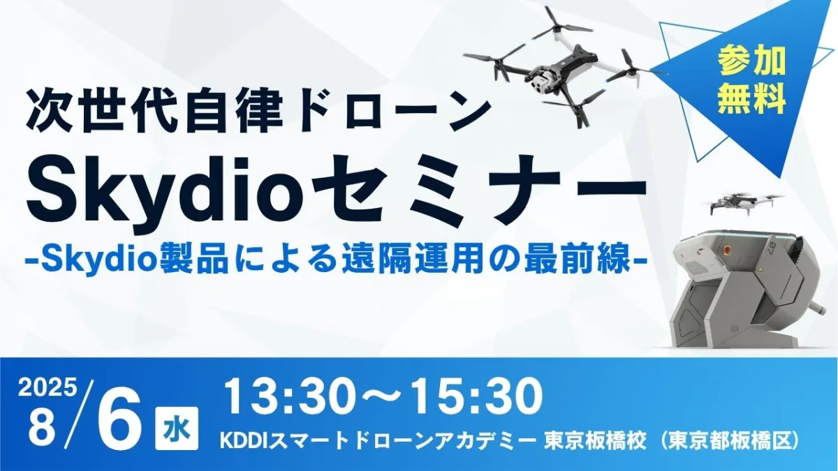 2025年8月6日(水)、東京都板橋区で「次世代自律ドローンセミナー ~Skydio製品による遠隔運用の最前線~」が開催されます。このイベントは、田中電気株式会社が運営する「秋葉原ドローンスクール」とKDDIスマートドローン株式会社が共同で主催しており、参加費は無料で、事前申し込みが必要です。
