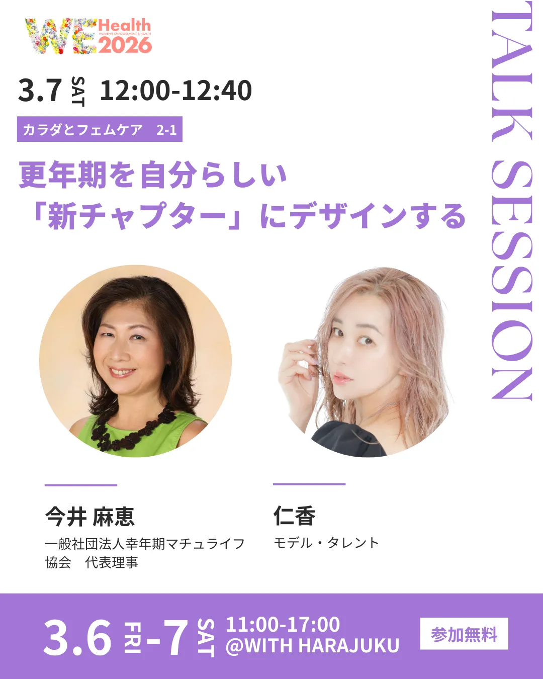 このトークセッションは、2026年3月7日(土)12:00〜12:40に、WITH HARAJUKUの3階ホールで開催されます。参加は無料ですが、事前申し込みが必要です。本セッションを通じて、自分自身の変化への考え方を変え、より心地よく過ごす為の自然なケアや選択肢を見つけるきっかけを得ることができるでしょう。