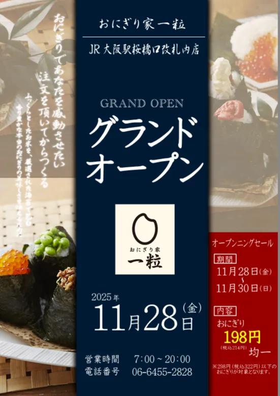 11月28日(金)、JR大阪駅の桜橋口改札内に、人気のおにぎり専門店「おにぎり家一粒」が新たにオープンします。電車の乗り換え時に利用しやすい立地で、いつでも握りたての美味しいおにぎりを楽しむことができます。オープニングセールも予定されており、この機会を逃さずにぜひ立ち寄ってみてください。