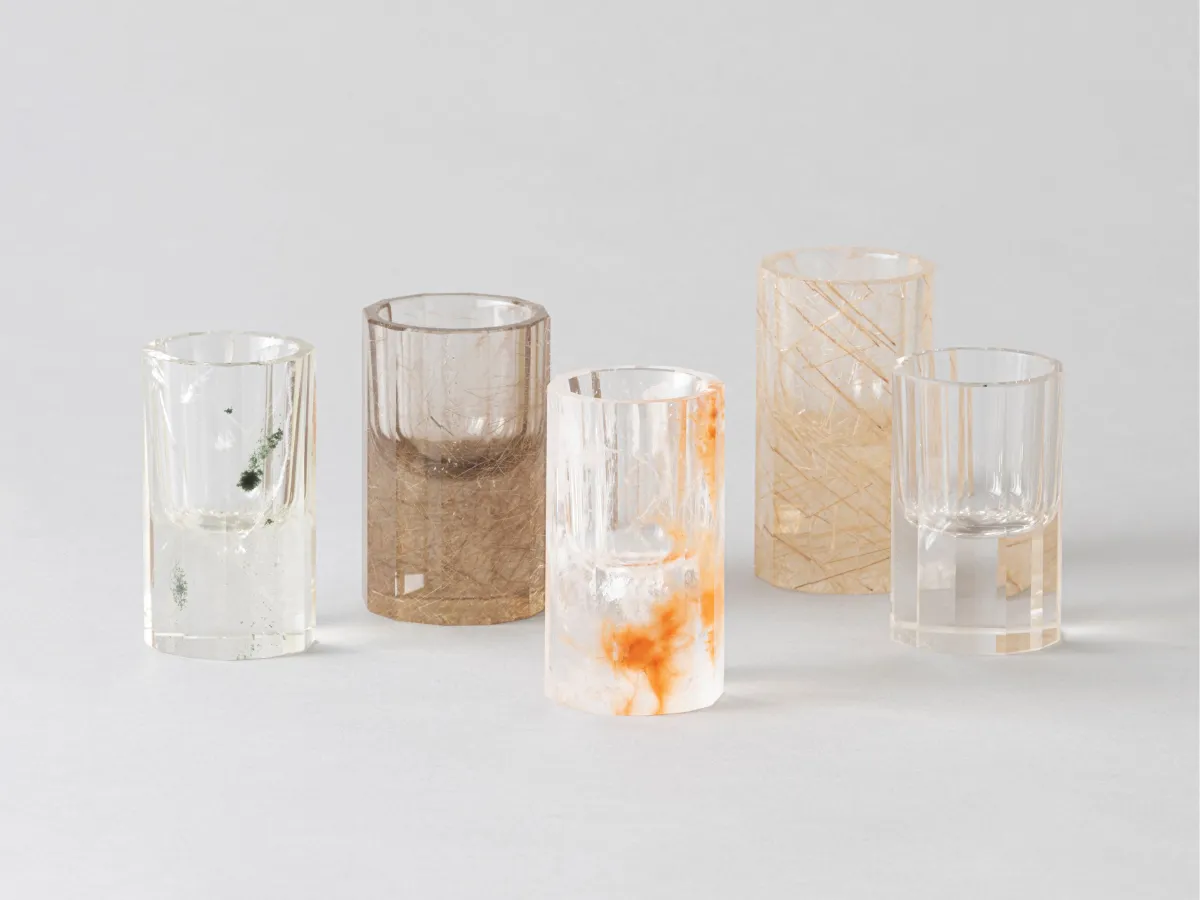 柴田氏とのコラボ作品であるショットグラスは、従来の形状を超えた美しいフォルムを持ち、どちらも原石の特性を生かしたデザインに仕上げられています。ショットグラスは330,000円(税別)からの価格で、原石の魅力を存分に引き出した作品が揃っています。