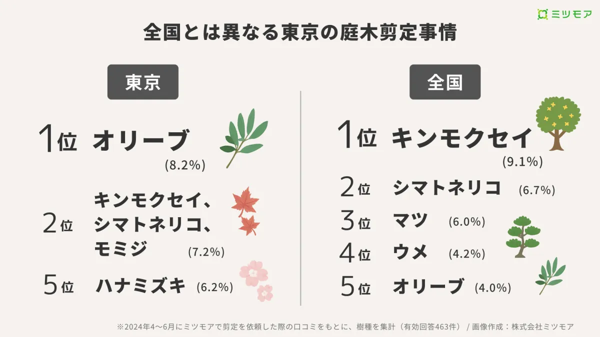 今回の調査では、全国で最も人気のある剪定樹種が明らかになりました。1位はキンモクセイ、続いてシマトネリコ、マツ、ウメが続き、オリーブは5位でした。これに対して東京都ではオリーブが突出しており、その理由として、成長の早さや美観を重視する声が強くあることが伺えます。