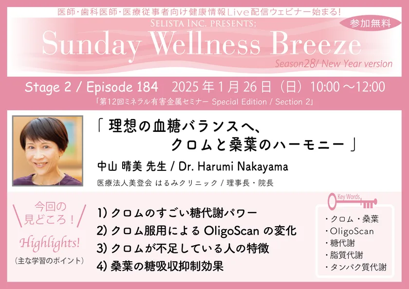 医療従事者の皆様、新しい知識を得るチャンスが到来しました!2025年1月26日(日)の午前10時より、無料のZoomオンラインセミナー『理想の血糖バランスへ、クロムと桑葉のハーモニー』が開催されます。このセミナーでは、医療法人美登会はるみクリニックの理事長・院長である中山晴美先生を講師に迎え、血糖バランスに密接に関連するクロムと桑葉の役割について深掘りします。