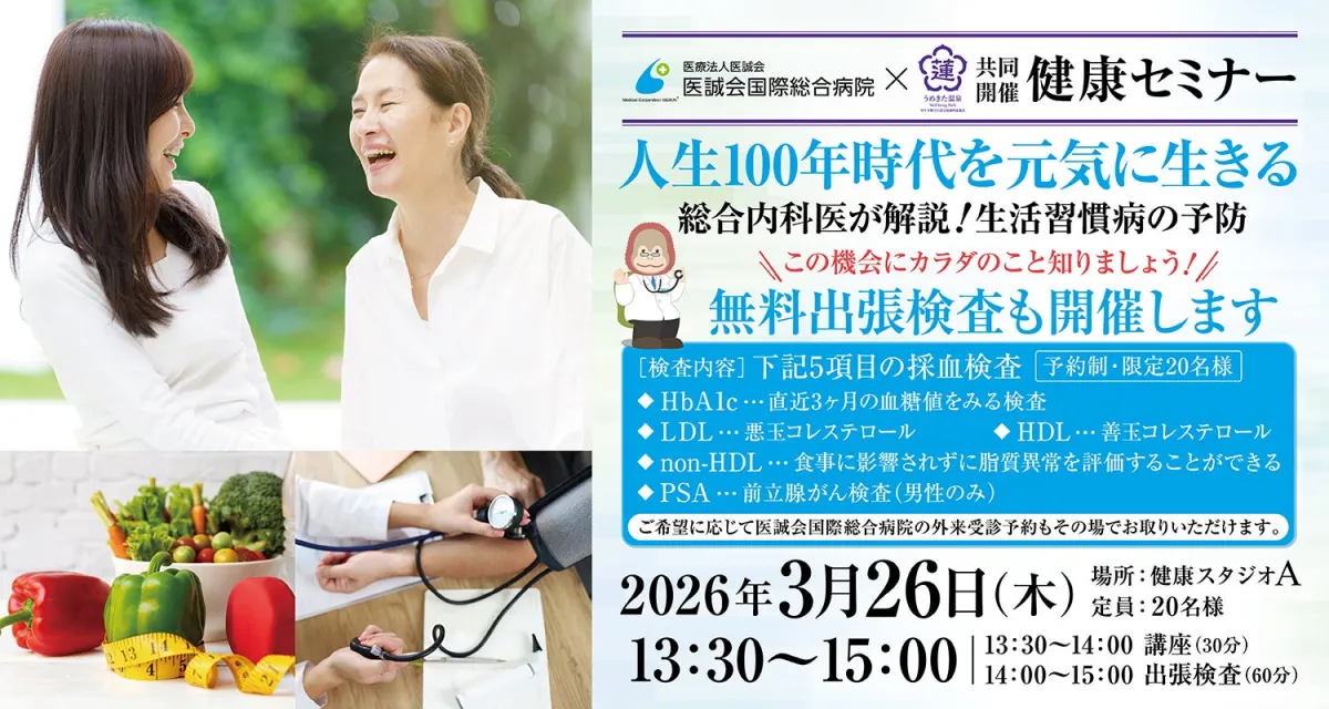 2026年3月26日、うめきた温泉 蓮 Wellbeing Parkにて第11回健康セミナーが開催されます。このセミナーは、医誠会国際総合病院と共同で行われ、講師に総合診療センターセンター長の森田龍平医師を迎えます。