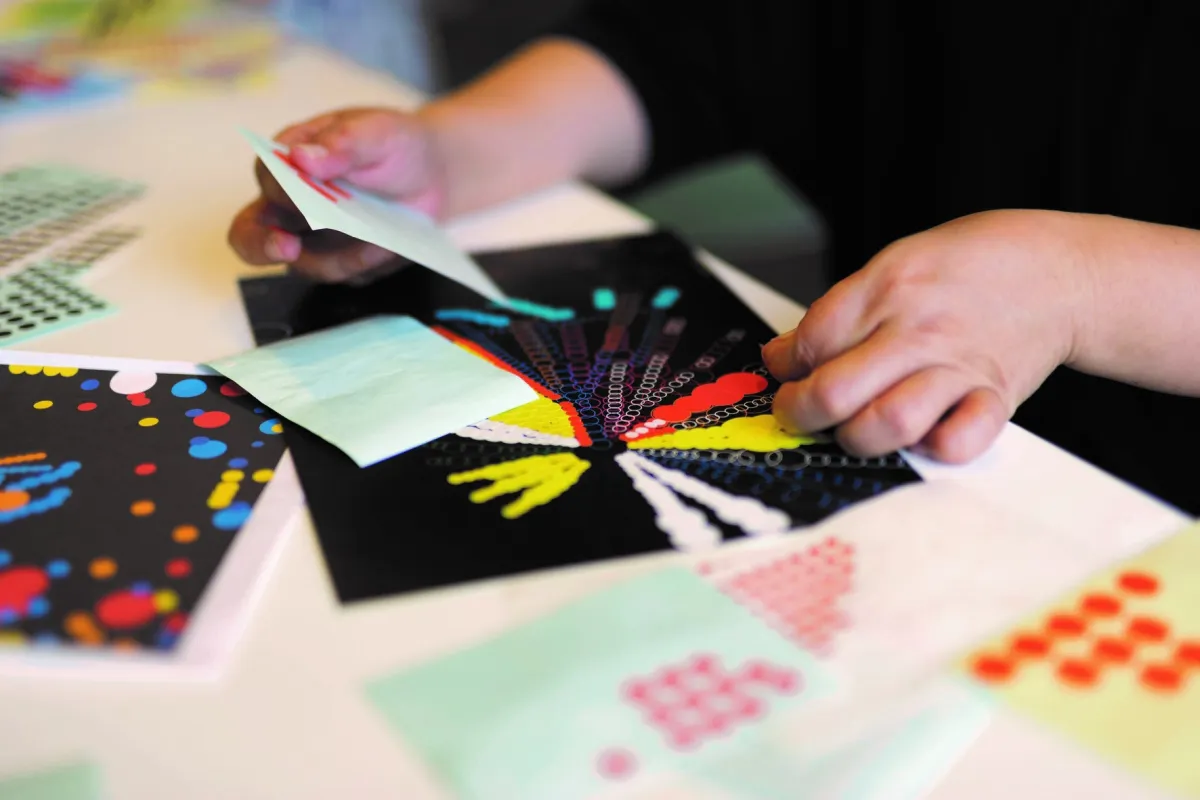 ワークショップの一例として、人気シールアーティストの大村雪乃さんによる「丸シールで夏の風物詩を描いてみよう!」があります。このプログラムでは、文房具の丸シールを使用して、夏の象徴的な描写を作成することができます。「ひまわり」「花火」「風鈴」などの下絵から選び、輪郭線に沿ってシールを貼るだけで、誰でも素敵なアートが完成します。
