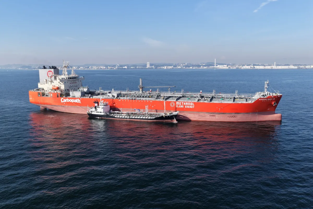 メタノールは、基礎化学品として多岐に渡る用途を持ち、特に燃料としては比較的クリーンな燃焼特性があります。従来の重油に代わる代替燃料として注目されており、GHG(温室効果ガス)の排出削減に寄与する可能性があります。今回は、商船三井が運航するメタノール二元燃料外航船「第七甲山丸」と国華産業が運航する内航ケミカルタンカー「英華丸」間で行われました。