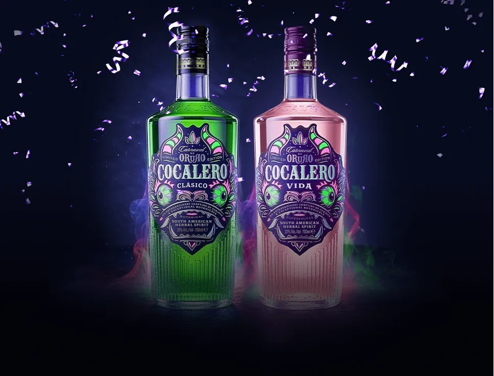 今回の春夏限定ラベルボトルは、ディアブラダの仮面をモチーフにした特別デザインです。クラシコは黒地にグリーンとピンクを使用し、力強さと躍動感を表現。ヴィーダはピンク地にパープルの華やかなカラーを使用し、カーニバルの祝祭感を表現しています。これらのボトルは、オルロのカーニバルが体現する自由や生命力と、コカレロブランドの精神を融合させた特別な商品です。
