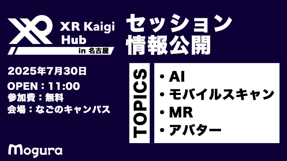 今年の7月30日(水)、愛知県名古屋市にて、最新のXR(拡張現実)やAI(人工知能)に関するイベント「XR Kaigi Hub in 名古屋」が開催されます。主催する株式会社Moguraは、このイベントを通じて国内のXRに関わる企業やクリエイターたちが集まり、最新の知見や技術を共有する貴重な場を提供しています。