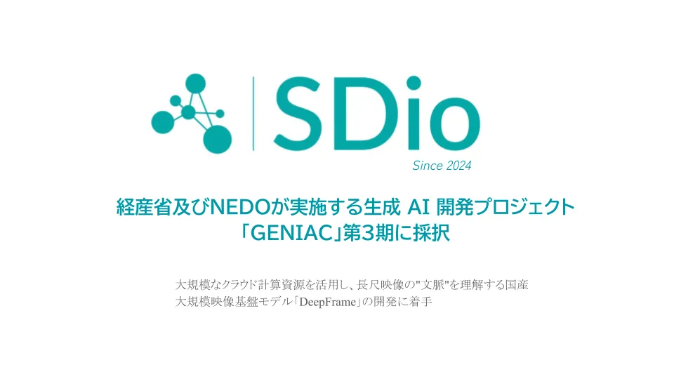 SDio株式会社は、東京の中野区に本社を置くAIスタートアップで、その企業のミッションは「Deep Search for Deep Insight」です。このビジョンのもと、テレビコンテンツを秒単位で検索できるAI検索プラットフォーム「TVPulse」の提供を行い、エンタープライズ向けの大規模映像基盤モデルの研究開発に取り組んでいます。また、SDioは今後、グローバルな視点で長尺映像基盤モデルの開発や社会実装によって、世界に影響を与える仲間を積極的に募集中です。