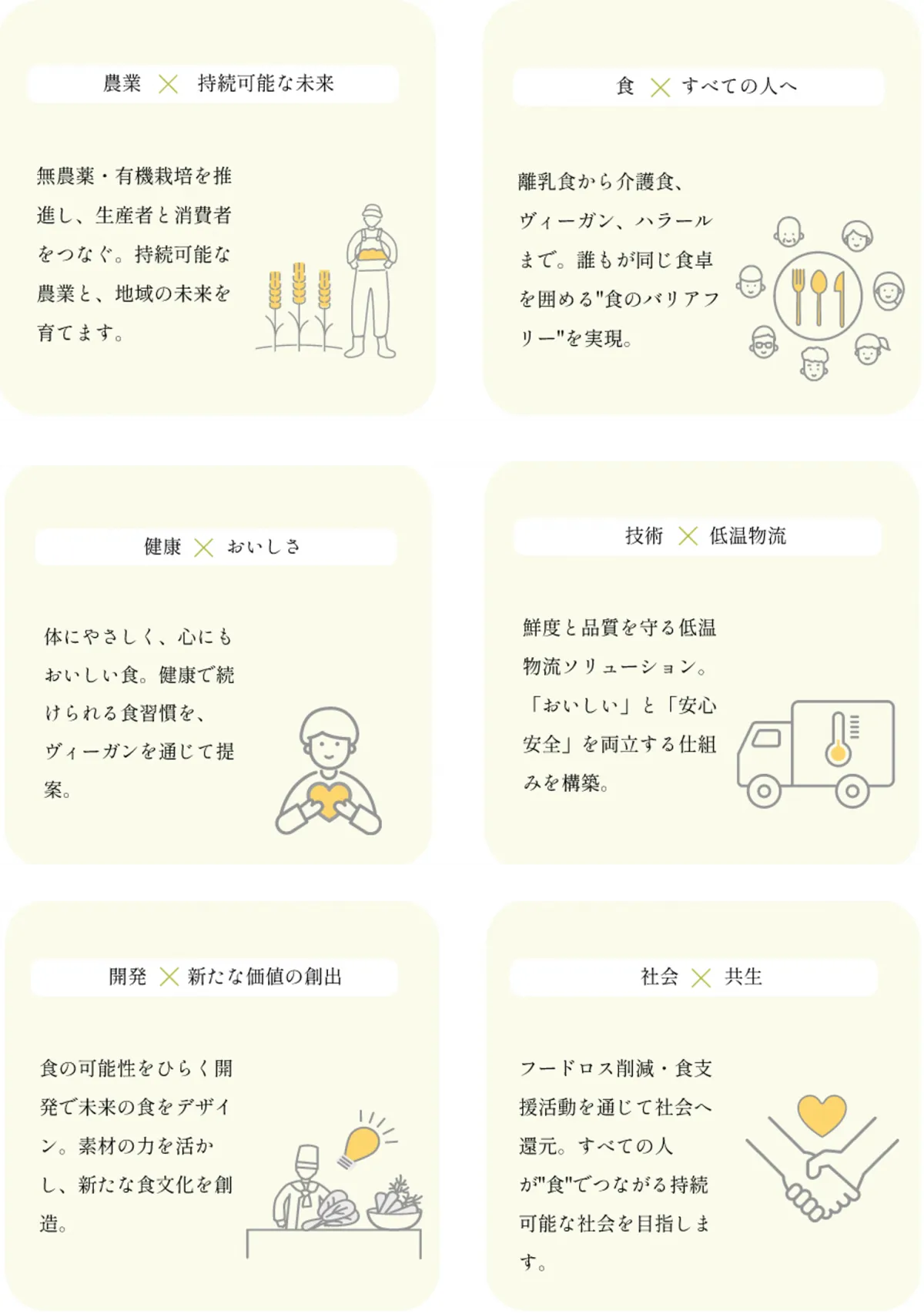 - - 事業内容: ヴィーガン対応を含む食の流通・供給、食品開発、地域商社事業など