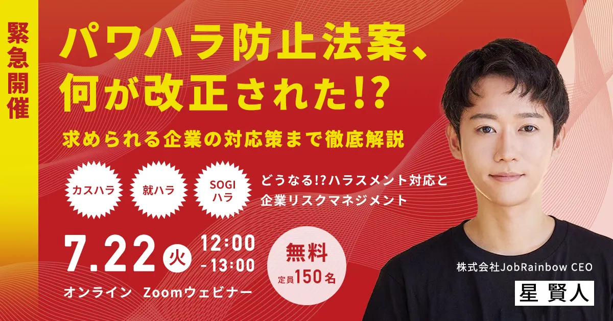 新たに施行されたLGBT理解増進法やそれに伴う法改正により、『SOGIハラ』という言葉が多くの人に知られるようになりました。この状況において、企業の対応が求められています。2025年7月22日、株式会社JobRainbowが主催する無料オンラインセミナー、『パワハラ防止法案、何が改正された!?求められる企業の対応策まで徹底解説』に参加することで、SOGIに関連する法改正のポイントを学びましょう。