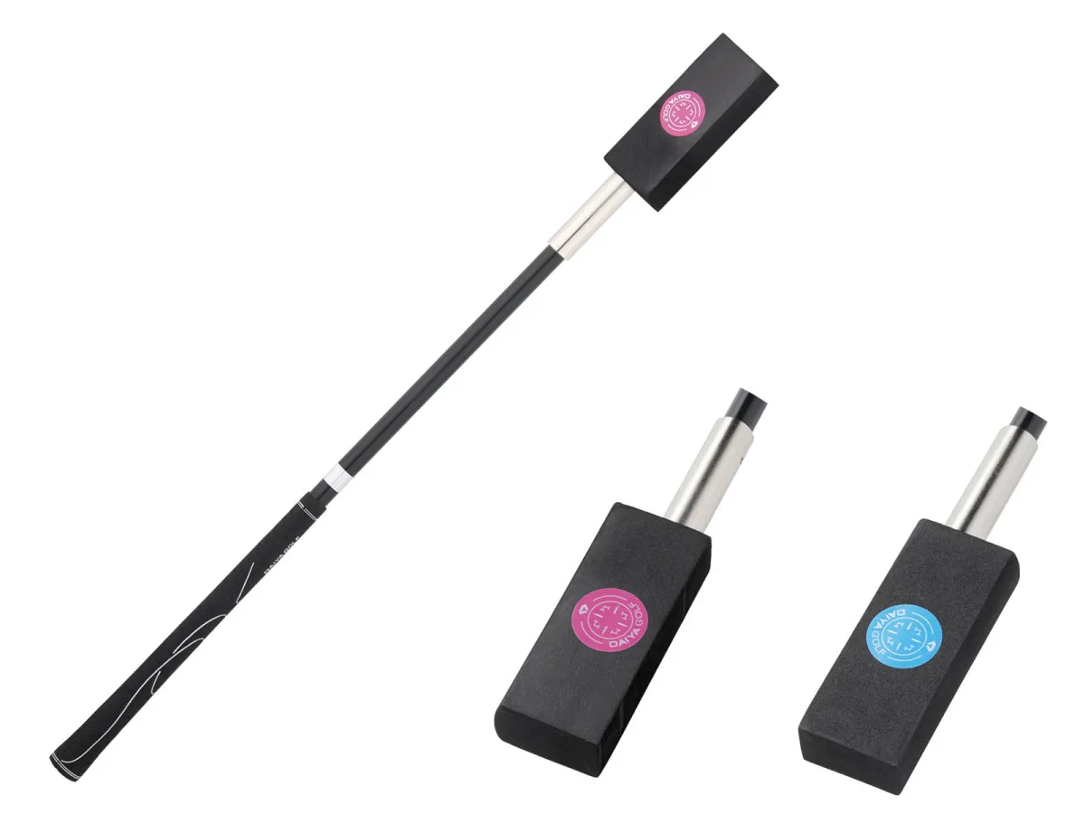 2025年9月15日に発売されるこの製品は、自宅で簡単にスイングの確認ができる新しいスタイルの練習器具です。『ダイヤスイングFX』は、ヘッドに貼られた二色のシール(ブルーとピンク)により、インパクト時のフェース面の向きを明確に示します。