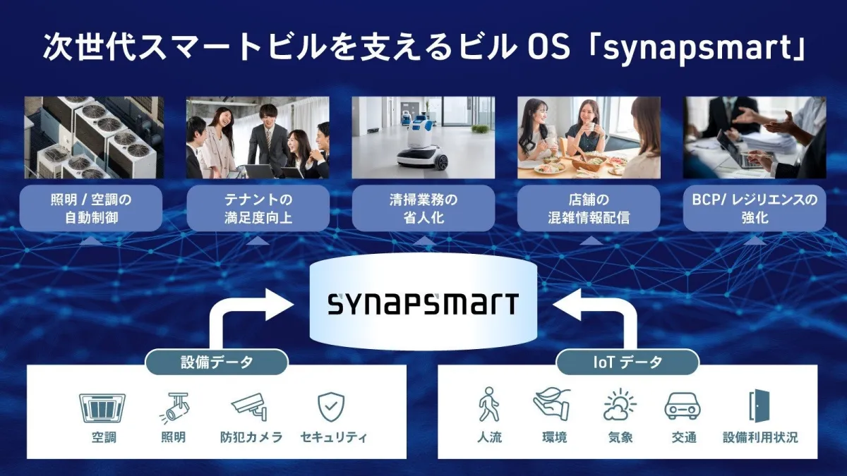 「synapsmart」は、IoTデータを使ってビル内の設備や環境データを一元管理し、リアルタイムでの可視化を実現する。空調、照明、防犯カメラなどの情報を集約することで、管理者はビル全体の状況を一目で把握できる。また、このシステムは新築と既存のビル両方に対応しており、運営の効率化を図ることが可能だ。