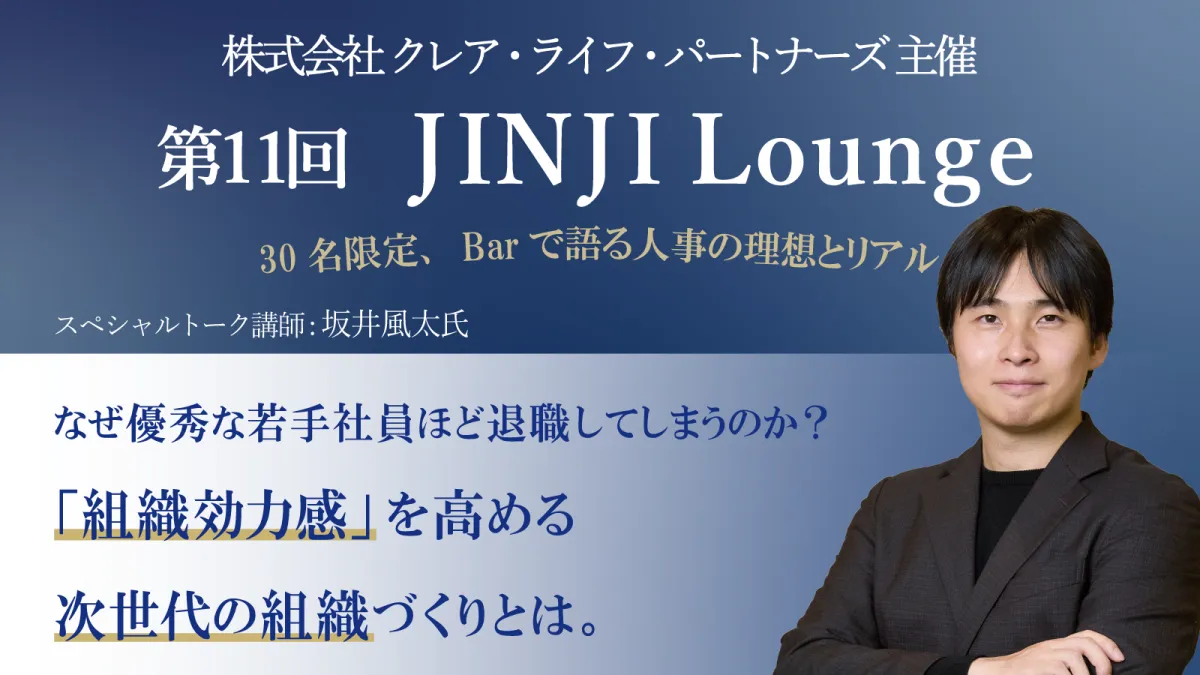 このたび、株式会社クレア・ライフ・パートナーズが主催する特別イベント「JINJI Lounge」が再び開催されます。第11回目となる今回のテーマは、「なぜ優秀な若手社員ほど退職してしまうのか? 組織効力感を高める次世代の組織づくりとは。」です。これを受けて、Momentor代表の坂井風太氏がスペシャルゲストとして登壇します。