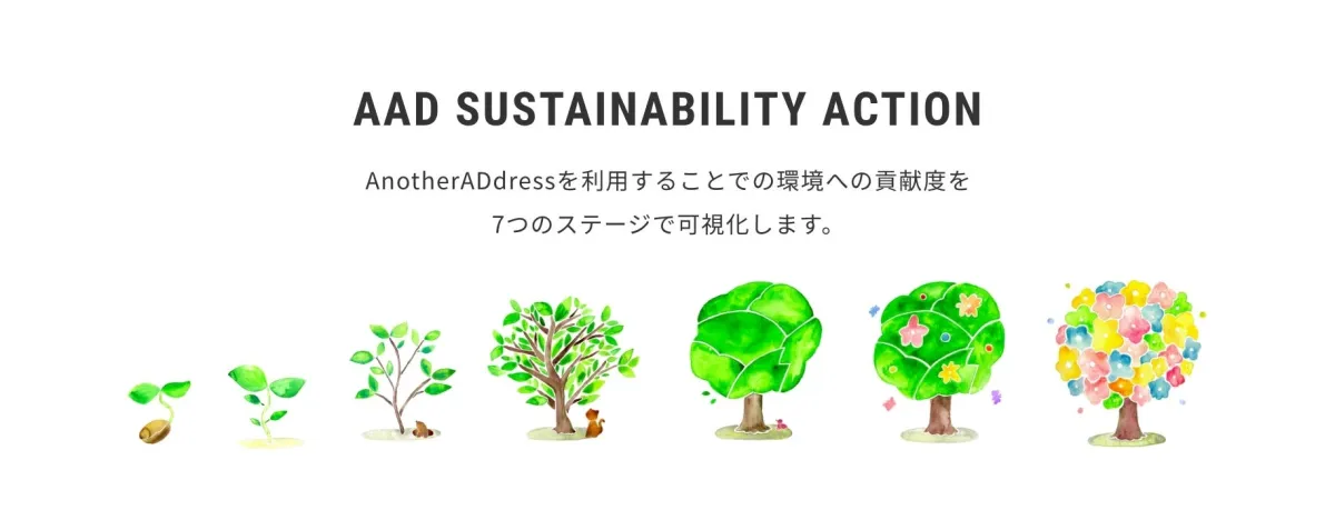 「AAD SUSTAINABILITY ACTION」は、株式会社BiSUSとの協力により、ファッションのレンタルや寄付行動に基づいて、利用者の環境貢献度を7つのステージで示します。アナザーアドレスのユーザーは、アイテムを借りるたびにアクションポイントが貯まり、ステージが上がることで、自己の貢献度を視覚的に理解できるかたちになります。