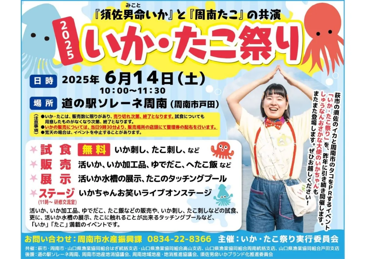 「いか・たこ祭り」は、令和7年6月14日(土)の10時から11時30分まで、道の駅ソレーネ周南で行われます。周南市戸田に位置するこの道の駅は、地域の特産品や新鮮な海の幸を楽しむことができるスポットとして知られています。