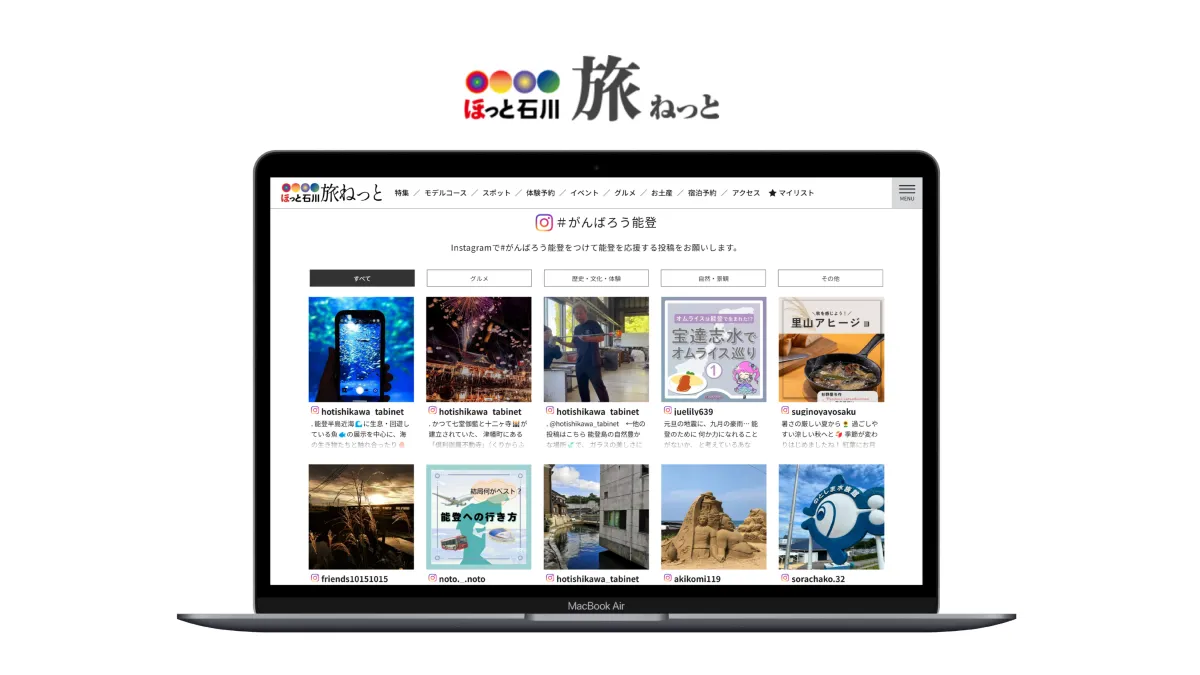 通常、観光地の魅力を伝える手段としてはプロの写真家による撮影や広告が一般的ですが、UGCは旅行者や地元の住民がシェアしたリアルな体験を活用することにあります。Instagramに投稿された「#がんばろう能登」のハッシュタグ付きの投稿を集めることで、能登の素晴らしさをより身近に感じてもらう狙いがあります。