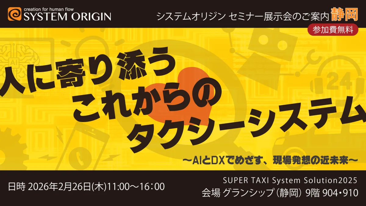 株式会社システムオリジンが主催するタクシー事業者向けのセミナー展示会「SUPER TAXI System Solution 2025」が、2026年2月26日に静岡で開催されます。本イベントでは、「人に寄り添う これからのタクシーシステム」をテーマに、急速に進化する自動運転技術や人工知能(AI)に対するタクシー業界の取り組みを紹介します。