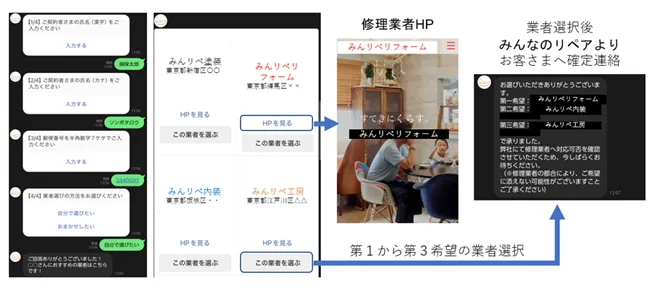 具体的には、希望する顧客へLINEでリンクを送付し、そのリンクから修理業者を選定してもらう仕組みとなっています。これにより、手間をかけずに自分の条件に合った業者を見つけられます。サービスは、スマートフォンからのアクセスが可能で、使いやすさにも配慮されています。