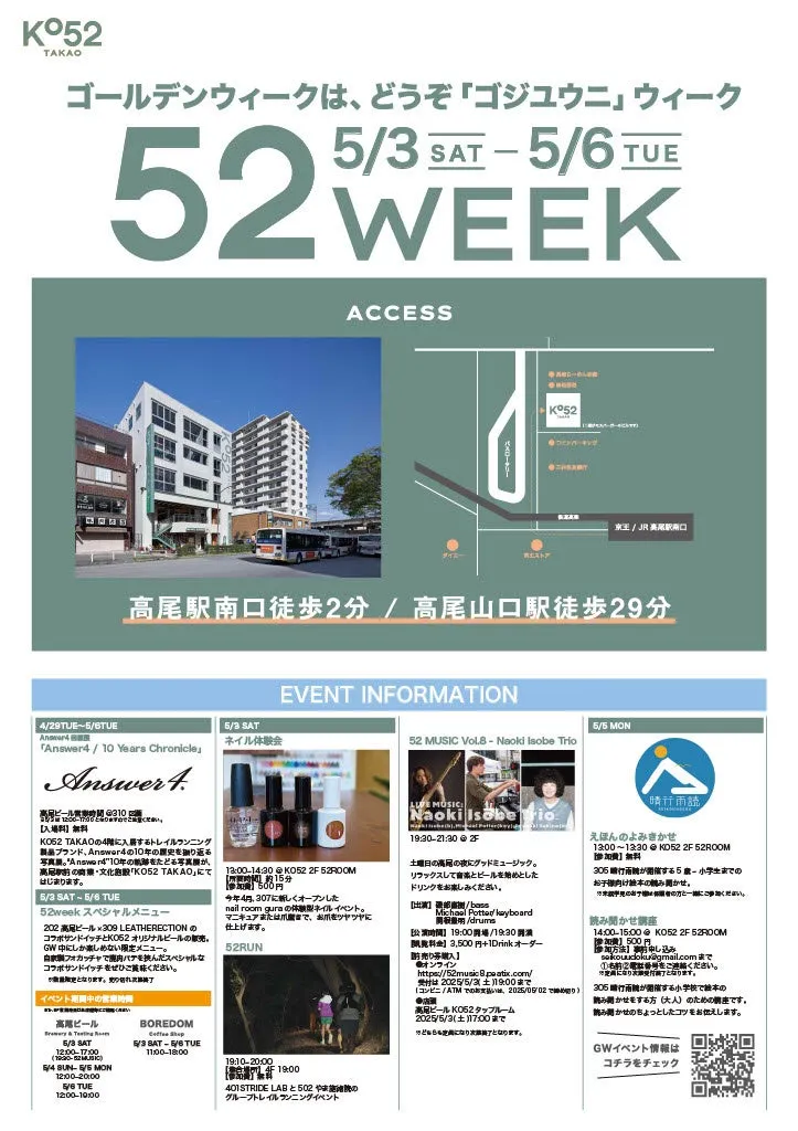 「52WEEK」は、【高尾ビール】【TRAIL RUNNING】などをテーマにした様々なイベントを展開。2階フロアではPOPUPイベントや音楽イベントが行われ、3階区画ではインタラクティブな展示が行われます。このイベントは、老若男女問わず楽しめる、まさに地域の祭典とも言える内容です。開催は、昨年に続いて二度目となるため、多くの期待が寄せられています。
