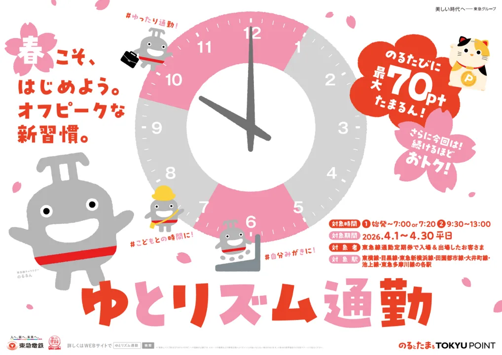 2026年4月1日から30日まで、東急の新たなキャンペーン「春こそ、はじめよう。ゆとリズム通勤」が実施されます。このサービスは、通勤の快適さを向上させることを目的としており、朝のピーク時間を避けることによって得られるTOKYU POINTが特徴です。キャンペーン期間中、対象の駅を通過することで、参加者は1日あたり最大70ポイントのTOKYU POINTを獲得できます。
