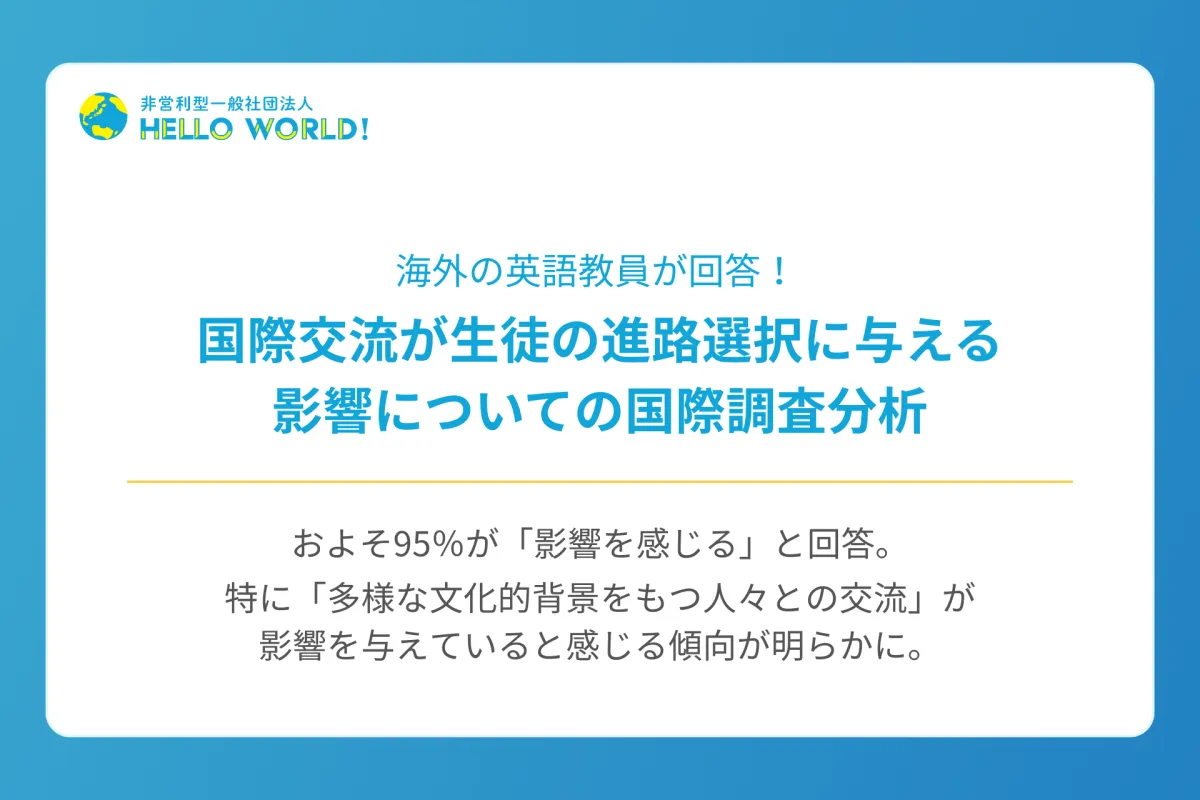一般社団法人HelloWorld(ハローワールド)は、国際交流や多文化理解を促進するために設立された組織です。今回、彼らは海外の英語教員を対象に「国際交流が生徒の進路選択に与える影響」に関する独自の調査を実施し、45名の教員からの回答を得て、その結果を公表しました。