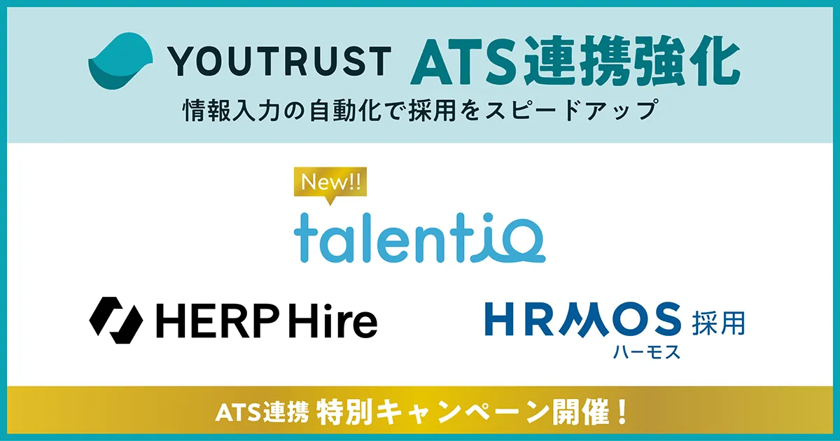YOUTRUSTは、ATS連携の強化を記念して「YOUTRUST ATS連携記念 スカウト20万円分どーんとプレゼント」と題したキャンペーンを開始しました。このキャンペーンでは、Talentio、HERP、HRMOSを導入している企業が対象となり、期間中にYOUTRUST TALENT Solutionを新規契約すると、20万円相当(40通)のスカウトを無償で提供します。この機会にぜひ、採用活動を前進させる役割を果たしていただければと思います。