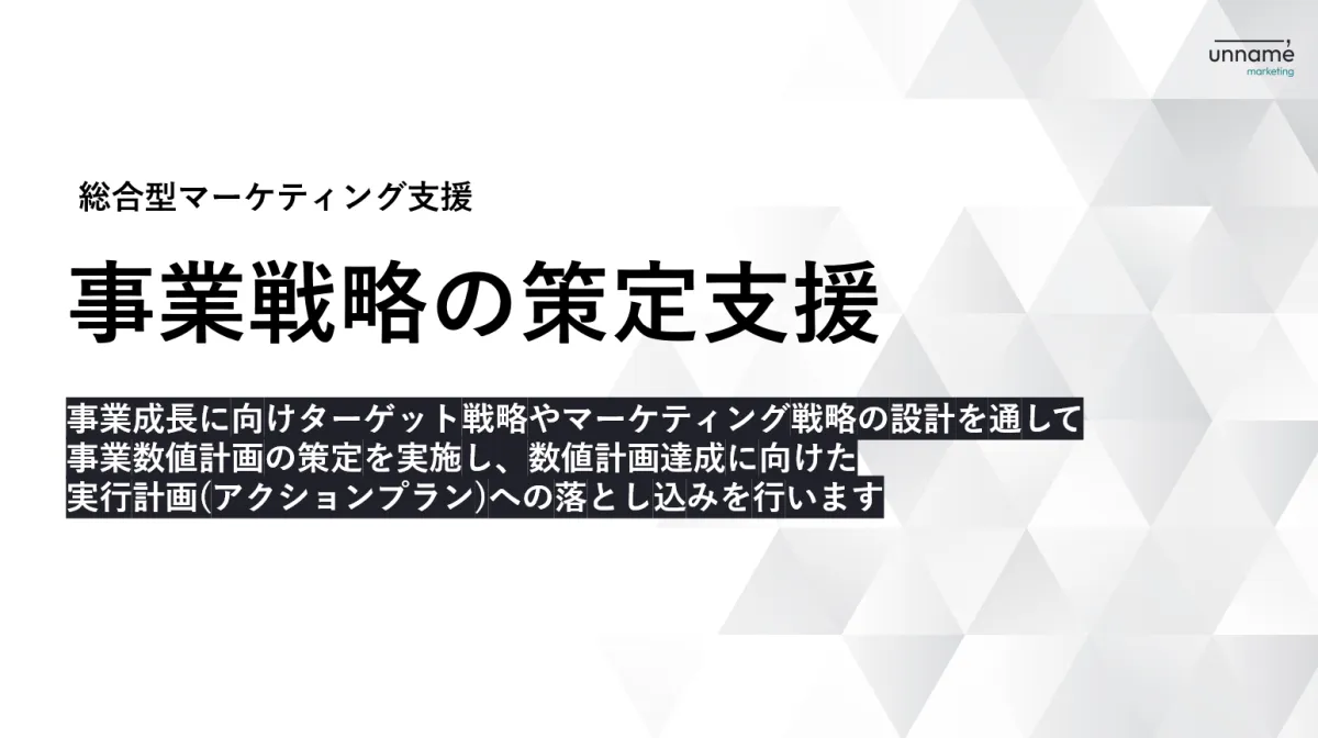 株式会社unnameは、2019年の創業以来、マーケティング支援に特化してきた企業です。この度、企業の持続的な成長を支えるべく新たに「事業戦略の策定支援」というサービスを開始しました。本サービスは、マーケティングの視点から企業が直面する様々な課題に対して、戦略的アプローチを提供します。