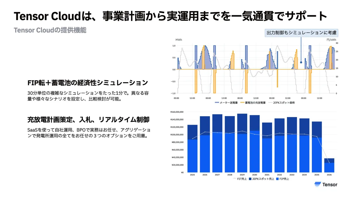 「Tensor Cloud」は、太陽光発電と蓄電池を利用した再生可能エネルギー発電所のために、計画段階から30年の間にわたり財務と運用を統合的に支えるクラウドプラットフォームです。AIやデジタル技術を活用したこのプラットフォームは、再エネ事業のビジネスモデルを変革し、持続可能な成長を促す要となります。
