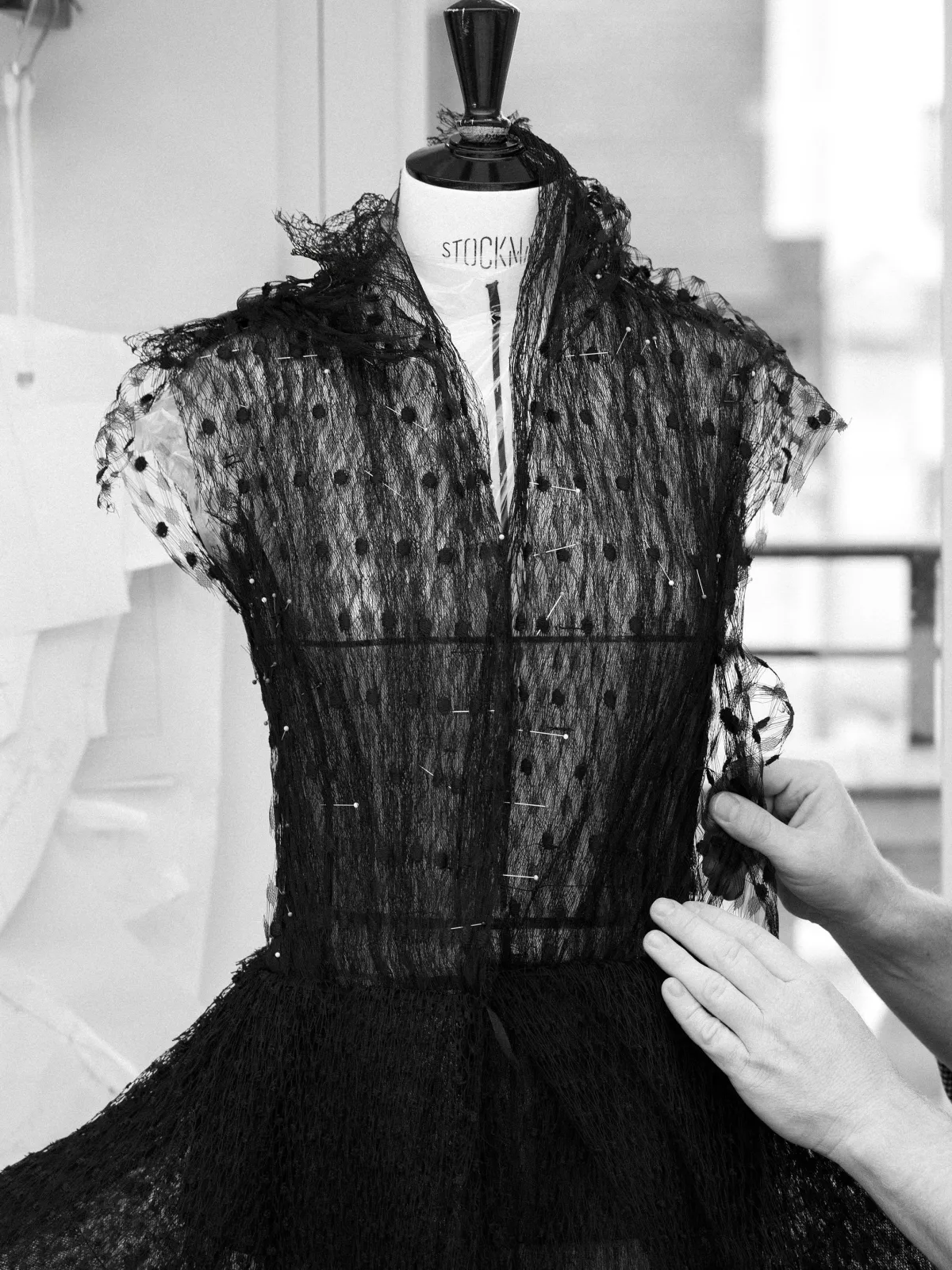 ブラントが着用したのは2026年春夏オートクチュールコレクションに属するドレスです。このドレスは、フレア状のホースヘアペプラムが特徴的で、非常に構築的なデザインとなっています。特に目を引くのは、5種類の異なるネット素材が重ねられ、ブラックツイードのような独特のテクスチャーを生み出している点です。この巧妙な重ね方が、ドレスのシルエットに奥行きを与えています。