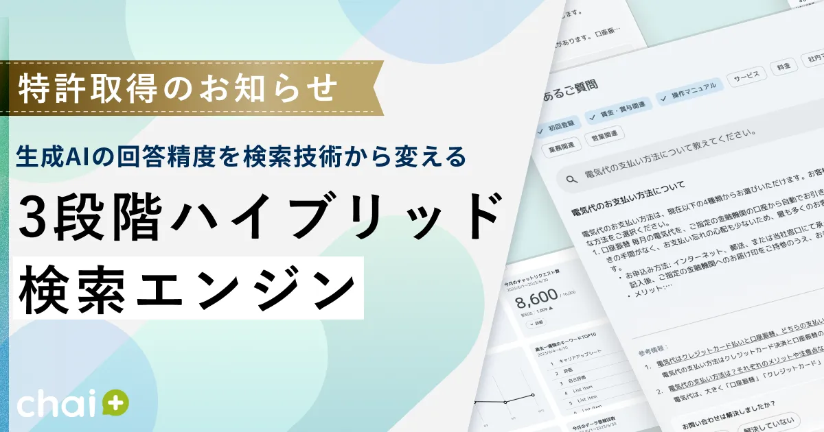 デフィデ株式会社は、RAG型AIチャットボット「chai+」の特許(特許第7851525号)取得を発表しました。この特許は、ユーザーが質問すると、文書を検索して回答を行うプログラムに関するものです。具体的には、三つの異なる検索手法を組み合わせたハイブリッド検索エンジンを特徴としており、生成AIの限界を克服する新たな技術を提供しています。
