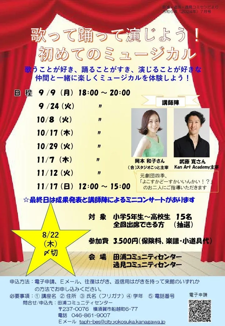 横須賀市で行われる『歌って踊って演じよう!初めてのミュージカル』講座が、2024年9月からスタートします。この講座は、元劇団四季のメンバーであり、現在は“よこすかどーすかいいんかい!?”を率いる岡本和子さんと、Kan Art Academyの主宰である武藤寛さんが講師として教えています。プロによる指導を受けながら、ミュージカルの魅力を体験する貴重なチャンスです。
