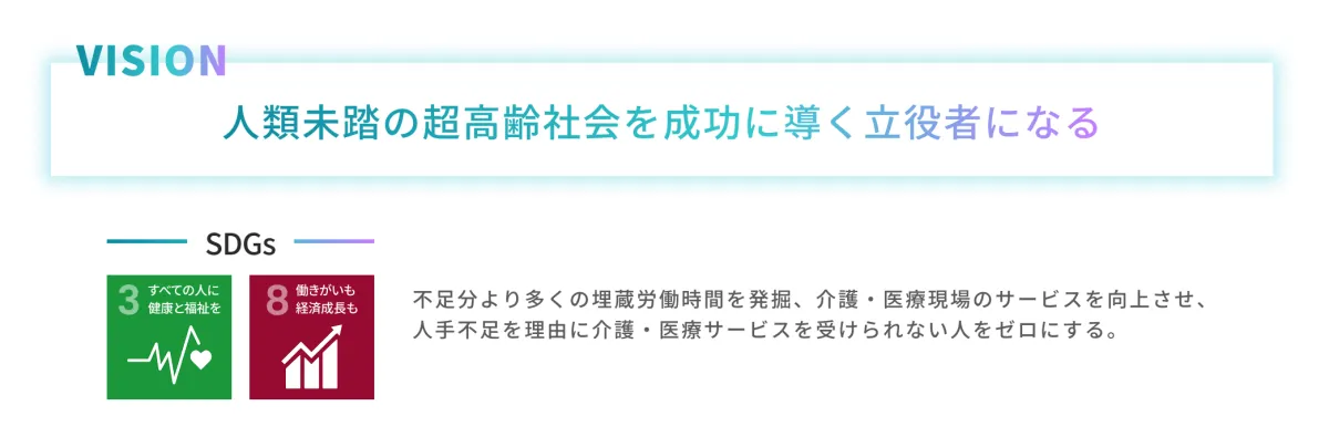 同社は、テクノロジーを駆使して介護・医療分野の課題解決を推進しています。特に有資格者の「未活用時間」を労働に変える仕組みを構築することで、急な人手不足に直面している事業所や柔軟な働き方を求める資格者を効果的に結びつけ、安定したサービス提供体制を構築しています。