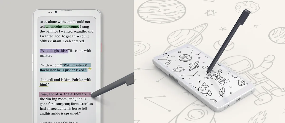 メイン画面には、カラーE Inkと白黒E Inkのオプションが用意されており、解像度は白黒が300PPI、カラーが150PPIとされ、鮮やかな色合いやクリアなテキスト表現が可能です。このE Inkディスプレイは、目に優しい設計で、長時間の使用でも目の疲れを軽減します。加えて、オプションのミニスタイラスを使用すれば、手書きのメモやスケッチがスムーズに行えます。このスタイラスは、ReadingやNote-takingに最適で、Bigme独自の「Infinity Canvas」機能により、無限に続くようなスケッチや記録が可能です。