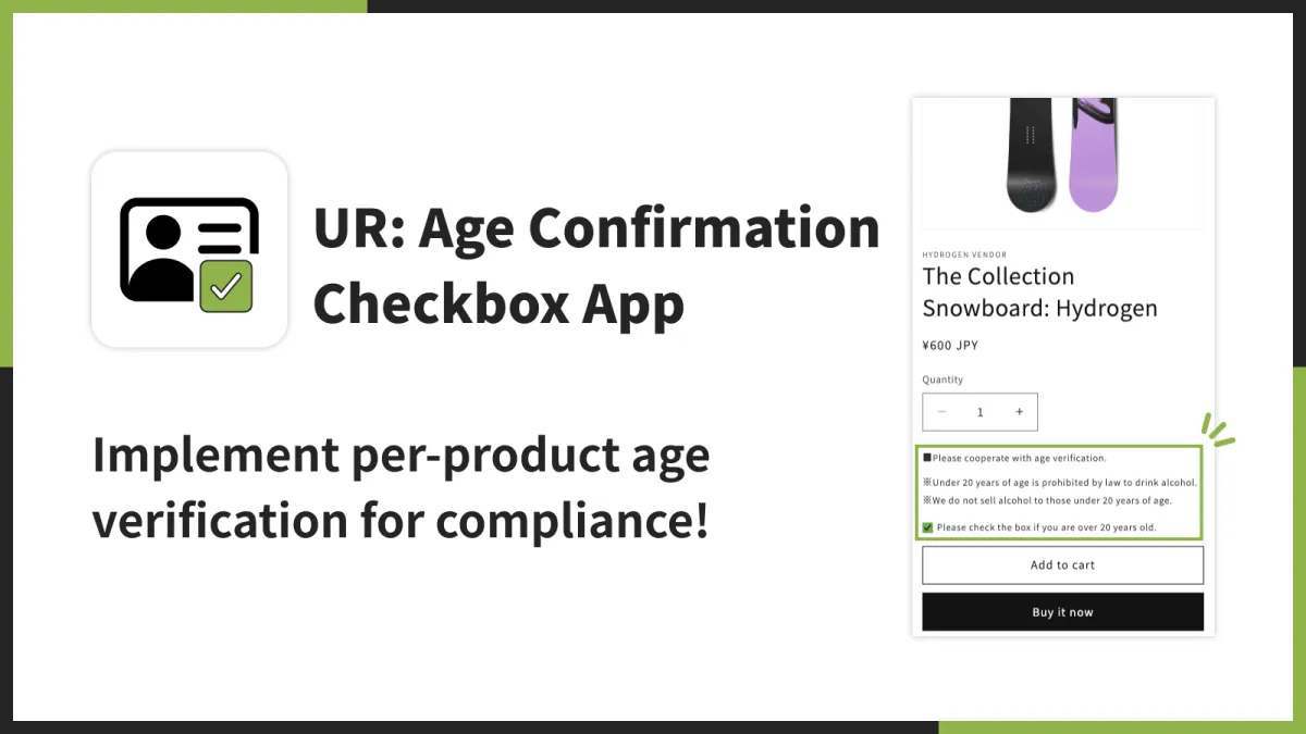 「UR: Age Confirmation Checkbox App」は、年齢確認が必要な酒類やタバコ類の購入を希望する顧客に対し、事前に年齢を確認するためのチェックボックスを簡単に表示できる機能を備えています。これにより、加盟店は購入者の年齢を適切に管理でき、法的なコンプライアンスを守りながら安心して販売を行うことが可能です。