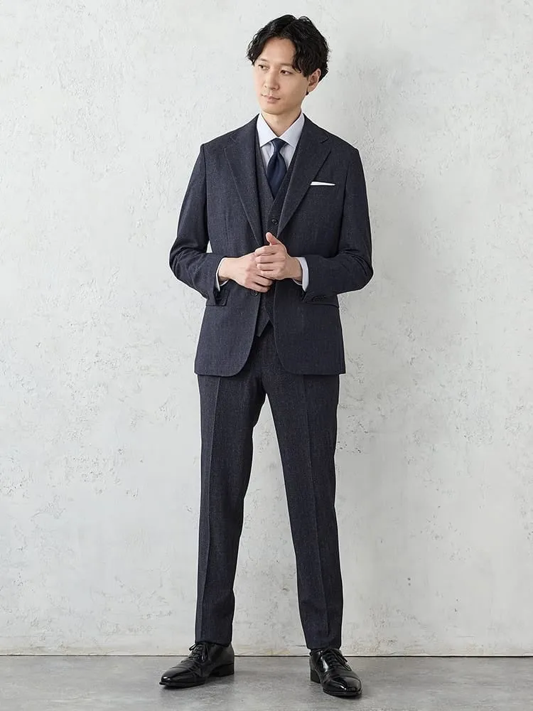 このセットアップは、背抜き仕様のジャケット、ストレッチの効いたワンタックパンツ、そしてTシャツとのコーディネートにも適したベストの3点セットです。個別に使用することが可能なので、さまざまなスタイルに対応できます。特に、プリント加工による清涼感のあるメランジ素材が用いられており、暑い季節でも快適に過ごせる設計になっています。また、家庭での洗濯も可能で、手軽なケアが魅力です。