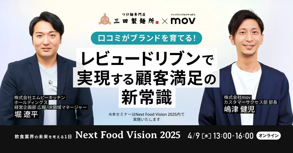 株式会社エムピーキッチンホールディングス(以下、エムピーキッチンHD)は、4月9日(水)に開催予定のイベント「Next Food Vision 2025」に参画します。このイベントは、訪日ラボと口コミコムを運営する株式会社movが主催するもので、飲食業界の新たな未来像を探るものです。エムピーキッチンHDの経営企画部マネージャーである堀遼平氏が登壇し、「口コミがブランドを育てる!レビュードリブンで実現する顧客満足の新常識」というテーマで講演します。