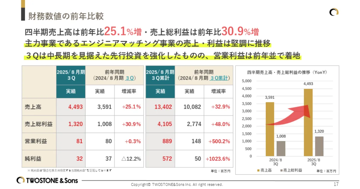 2025年7月14日、東京都渋谷区に本社を置く株式会社TWOSTONE&Sonsは、2025年8月期の第3四半期決算を発表しました。当社は、主力事業であるエンジニアマッチングサービスの売上が24四半期連続で最高値を記録し、業績は順調に推移していることを報告しました。