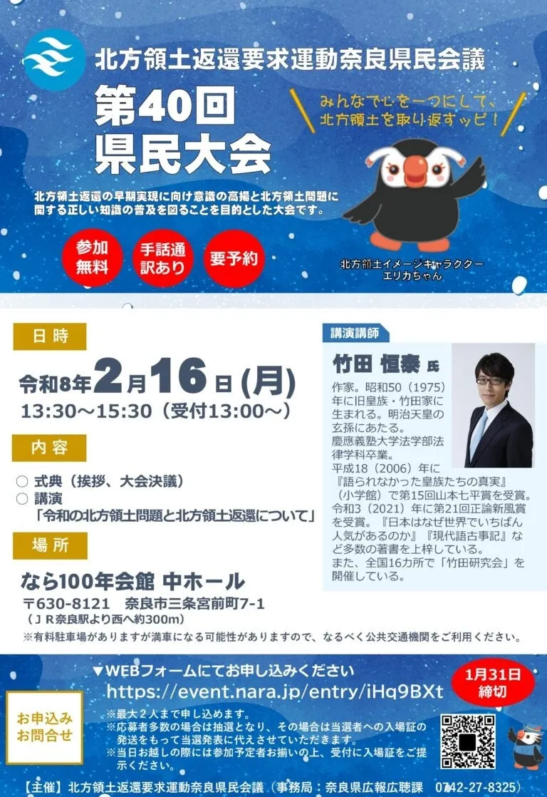 2024年2月16日(月)、奈良県内のなら100年会館中ホールにて、北方領土問題に焦点を当てた第40回奈良県民大会が開催されます。この大会は、北方領土返還要求運動奈良県民会議が主催し、13時30分から15時30分まで行われる予定です。開会に先立ち、13時には受付が始まります。