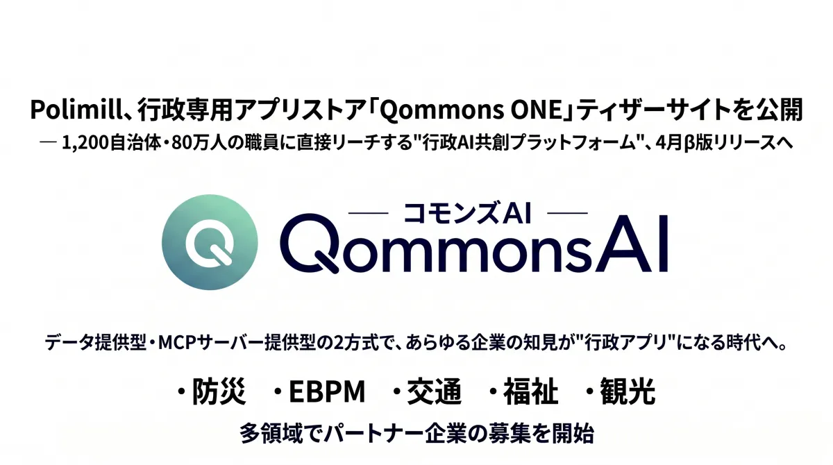 Polimill株式会社が、行政専用アプリストア「Qommons ONE」のティザーサイトを公開しました。この新しいプラットフォームは、全国1,200の自治体とおよそ80万人の職員に向けて、アプリを通じた行政サービスの提供を目指しています。リリースは2026年4月にβ版、6月には正式版を予定しています。