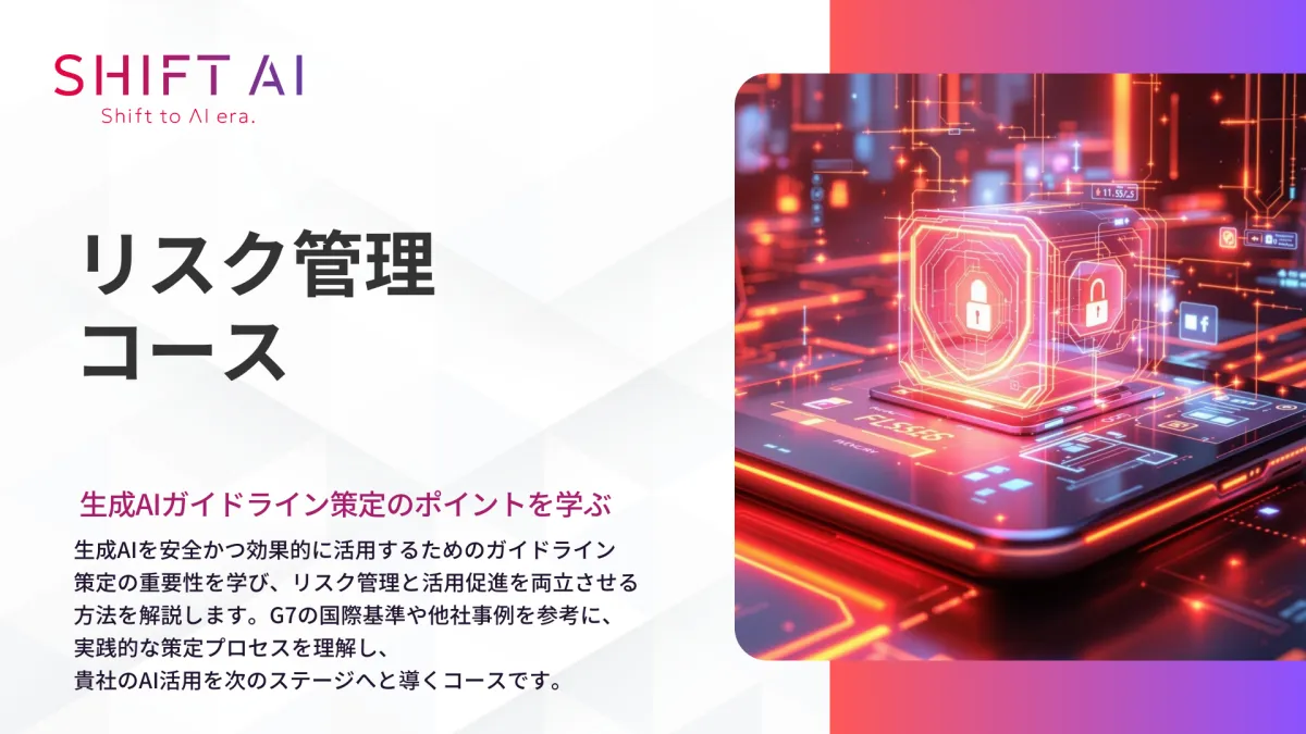 2025年3月13日、株式会社SHIFT AIが新しい法人向けコース「リスク管理コース」を提供を開始します。このコースは、生成AIの急速な普及を背景に、ビジネス環境における法的リスクやコンプライアンスへの対応を強化することを目的としています。AIの活用が進む昨今、企業は生成型AIを適切に使用するためのルール整備を迫られています。