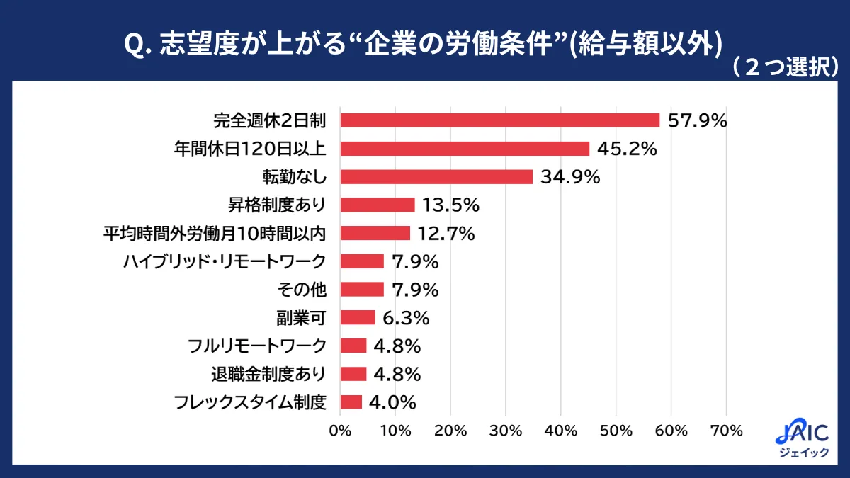 調査結果によると、20代求職者が志望度を高める労働条件の1位は「完全週休2日制」で、57.9%の参加者がこれを選びました。次いで「年間休日120日以上」が45.2%、「転勤なし」が34.9%と続いています。これらの結果は、現在の若者が健康やライフスタイルを重要視していることを示しています。