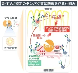 研究では、マウスの腎臓を用いて、GnT-Vが糖鎖をどのように付加するタンパク質を選ぶのかを調査しました。研究者たちは、GnT-Vが主に腎臓に存在する2つのタンパク質、ANPEPおよびMeprinαに糖鎖を付けることを突き止めました。