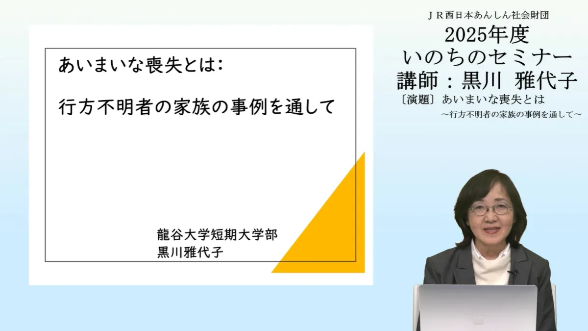 皆さまにお知らせです。2025年度の「いのちのセミナー」の第4回目が、WEB配信にて行われます。今年度の講師としてお招きするのは、龍谷大学短期大学部の黒川雅代子教授です。彼女は、震災による行方不明者の家族を事例にし、「あいまいな喪失」というテーマでお話しされます。このセミナーでは、別れの形が変わることについて、深く考える機会を提供します。