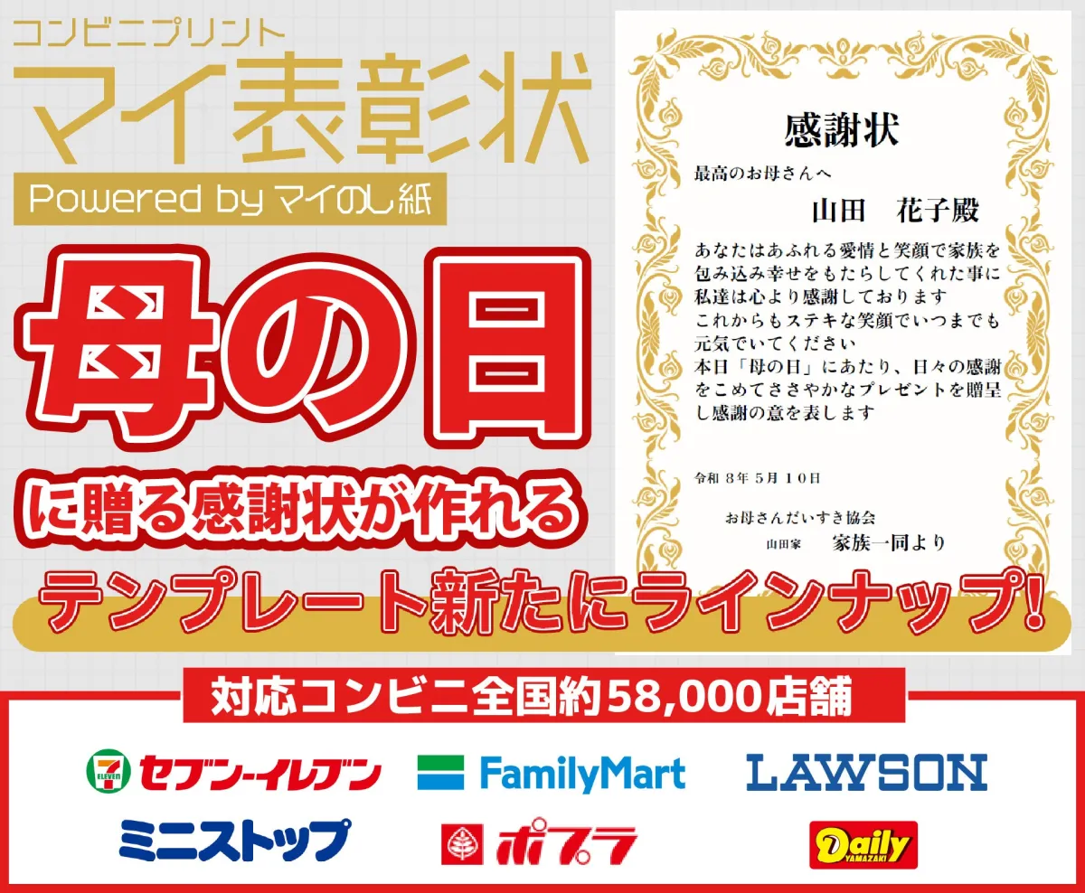 『マイ表彰状』は、自分の言葉で感謝の気持ちを表彰状として表現できる画期的なサービスです。全国約58,000店舗で利用できるこのサービスを通じて、お母さんへの感謝の気持ちを表彰状という形で贈ることができます。