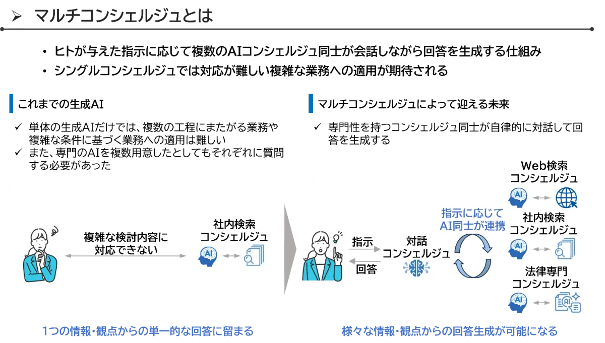 機能の追加にとどまらず、RAG技術に基づいた情報検索の精度を向上させる機能や、業務別に最適化されたテンプレートコンシェルジュも提供されます。これにより、登録したドキュメントの一括処理が可能になり、ユーザーの負担を軽減します。