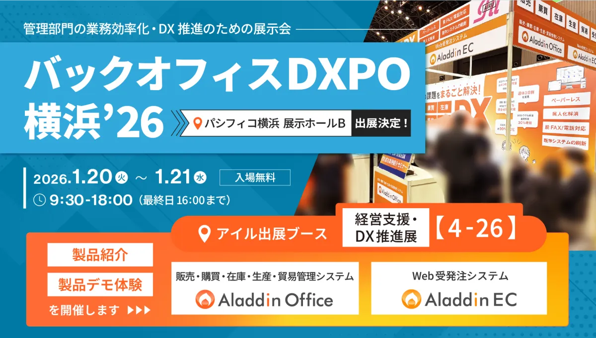 株式会社アイルは、2026年1月20日(火)・21日(水)に横浜のパシフィコで開催される「バックオフィスDXPO 横浜’26」に出展します。同社は自社開発の販売・在庫管理システム「アラジンオフィス」とWeb受発注システム「アラジンEC」を紹介します。これにより、企業のデジタルトランスフォーメーション(DX)推進と経営力の向上を支援します。