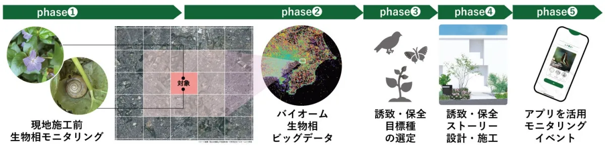 今回の協働では、様々なステップを踏んで生物多様性を保全する計画が詳細に設定されています。まず、大東建託は計画地周辺の生物調査を実施し、既存の生物相を把握します。次に、バイオームの解析技術を駆使して、その地域に適した生物の選定が行われ、選ばれた種を誘致・保全するための具体的な施策が設計されます。