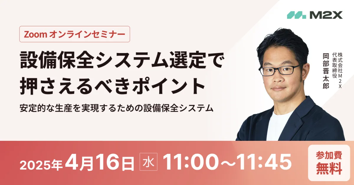 セミナーは、2025年4月16日(水)の11:00から11:45まで開催され、定員に達し次第、申し込みが締め切られます。登壇者は株式会社M2Xの代表取締役である岡部晋太郎氏です。岡部氏は東京大学卒業後、総務省でIT政策の企画に携わり、その後ボストン・コンサルティング・グループで製造業の戦略立案に取り組んできました。メンテナンス業界の重要性に惹かれ、2022年にM2Xを創業しました。