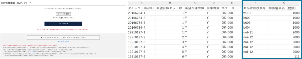 新しいCSV在庫確認機能は、バイヤーが複数の商品をまとめて在庫状況を把握できる仕組みです。従来の「希望在庫有無」「在庫有無」「エラーコード」に加え、新たに「商品管理枝番号」と「卸価格単価」といった重要なデータも表示されるようになりました。これにより、在庫情報の管理が一層スムーズになり、バイヤーは仕入れの戦略を立てやすくなります。