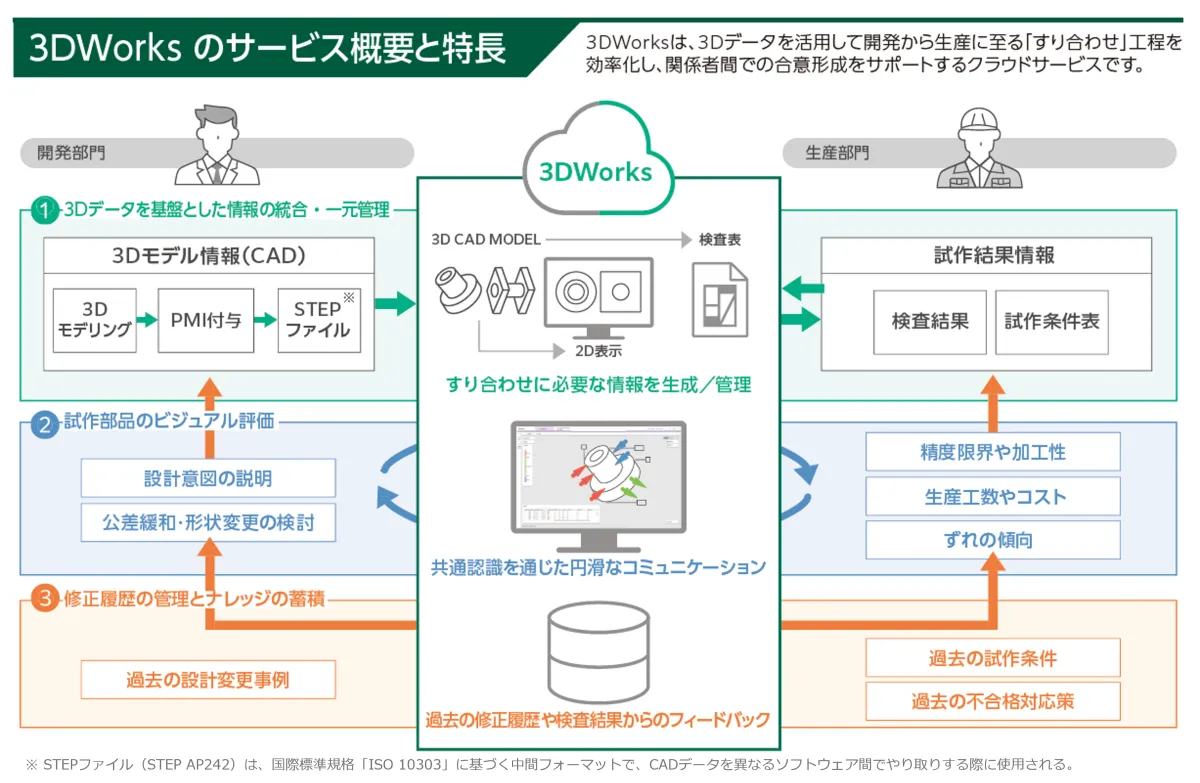 「3DWorks」は、量産開始前の試作工程において、必要な情報を3Dモデル上に統合し、部門間の調整をスムーズに行うことができるクラウドサービスです。具体的には、設計や製造条件の調整を行う際の情報を、一元的に管理できるため、熟練技術者の経験に依存することなく、より科学的なデータに基づいた意思決定が可能となります。